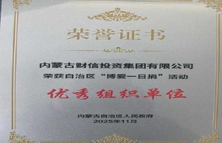 近日,內蒙古財信投資集團有限公司被內蒙古自治區政府授予“博愛一日捐”活動“優秀組織單位”榮譽稱號,并作為獲獎代表出席了在內蒙古電視臺舉行的頒獎儀式。